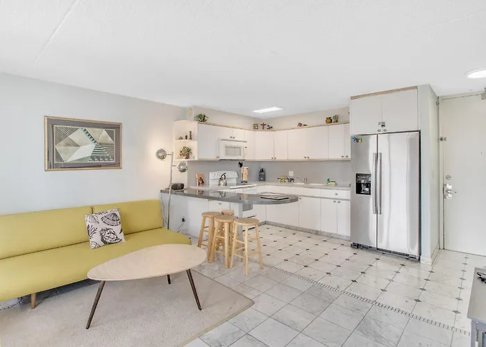 ベッドルーム1室のSteps To The Beach! Gorgeous Ocean-View Condo With Complimentary Parking ホノルルはホノルル動物園とセント オーガスティン カソリック教会から歩いてたった8分に位置し、山の景色を望めます。 フード・パントリーすぐ近くの場所に位置するこの50m²のアパートは、海辺の景色を望むテラスを提供しています。